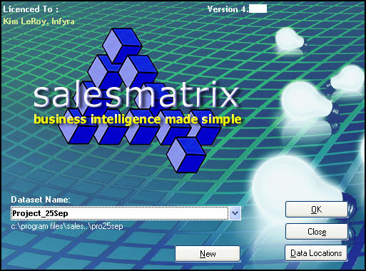 New.... This opens a screen allowing the user to select a variety of wizards enabling data to be imported into Salesmatrix. Register. If this button appears, you are running in Demonstrations mode. You have 14 days from installation in this mode and while you are able to open and manipulate existing datasets, the loading of new datasets is restricted as the majority of the product names are renamed to reflect the use of demonstration mode. Clicking on this button opens up the Salesmatrix Licensing screen, including the ability to print a registration request for faxing, or registration direct from a web page. Data Locations... This option allows the user to browse disk volumes for Salesmatrix datasets. Clicking the button opens a window allowing the user to point to the appropriate directory and select a SMATRIX.DBC file.